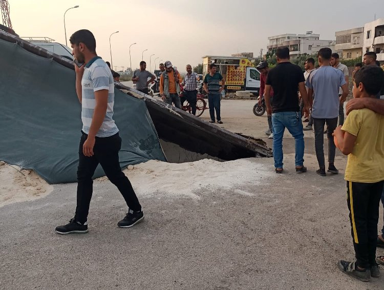 Sürücüsü öğrenilemeyen 01 AIL 179 plakalı kum yüklü tır, yolda oluşan çukura düştü.