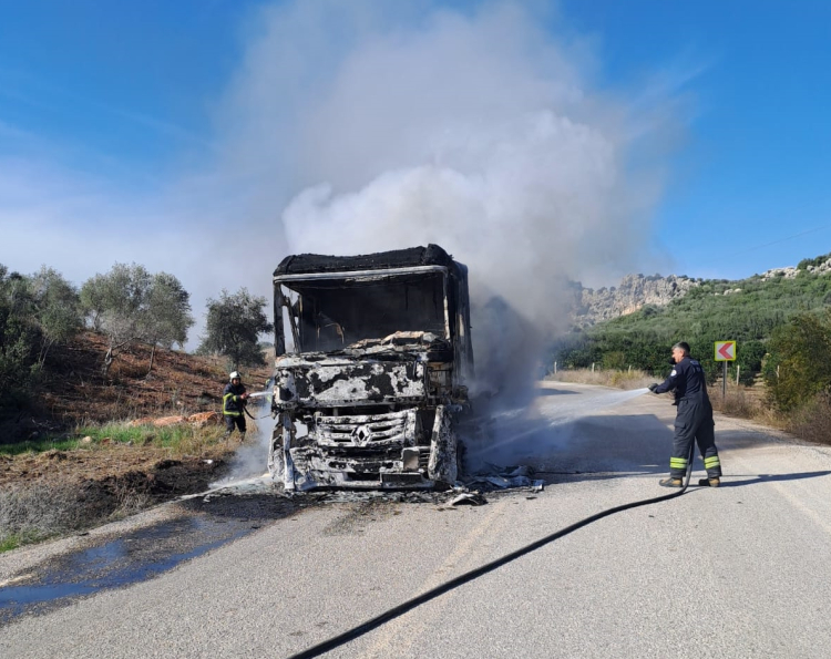 Olay yerine sevk edilen itfaiye ekiplerince söndürülen yangında tırda hasar oluştu.