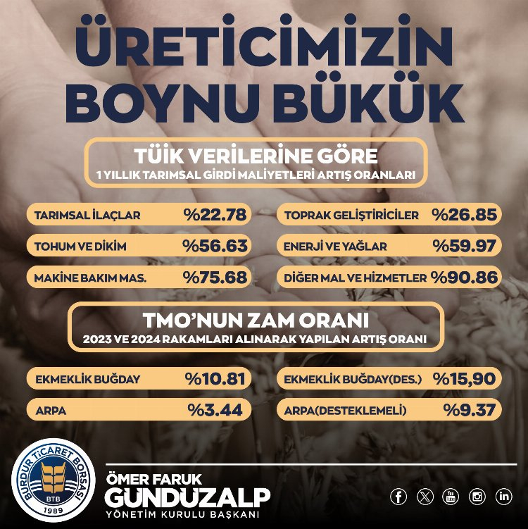 Zam oranını, üreticiyi üretimden koparma anlayışı olarak gören Başkan Gündüzalp, “Resmen üreticimize ekme, dikme, bu işi bırak denilmektedir. Bu rakamlar üreticimizin boynunu bükmüş, özellikle kuraklıkla mücadele etmeye çalışan bölgemizde, tarımsal üretimi tehlikeye sokmuştur. TÜİK’in Tarımsal Girdi Maliyetlerine baktığımızda hesap ortadadır. Tarımsal İlaçlar %22,78, Gübre ve Toprak Geliştiriciler %26,85, Tohum ve Dikim Materyalleri %56,63, Enerji ve Yağlar %59,97, Makine Bakım Masrafları %75,68, Diğer Mal ve Hizmetler %90,86 artış görmüştür. Tarımsal Üretim Enflasyonu ise %49,93’tür. Buğday ekim maliyeti de kilogram başına 10 TL’nin üzerindedir. Bu rakamlara karşı arpa ve buğday alım fiyatını çok düşük oranlarla açıklamak, zorluklarla üretim mücadelesi veren, bu işi milli bir mesele olarak gören üreticilerimizi topraktan uzaklaştırmaktan başka birşey değildir.” dedi.