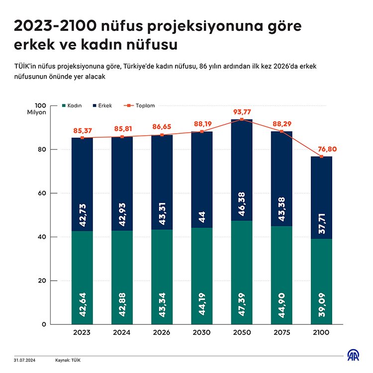 TÜİK'in 2023-2100 nüfus projeksiyonuna göre yıllar itibarıyla erkek ve kadın nüfusu şöyle: