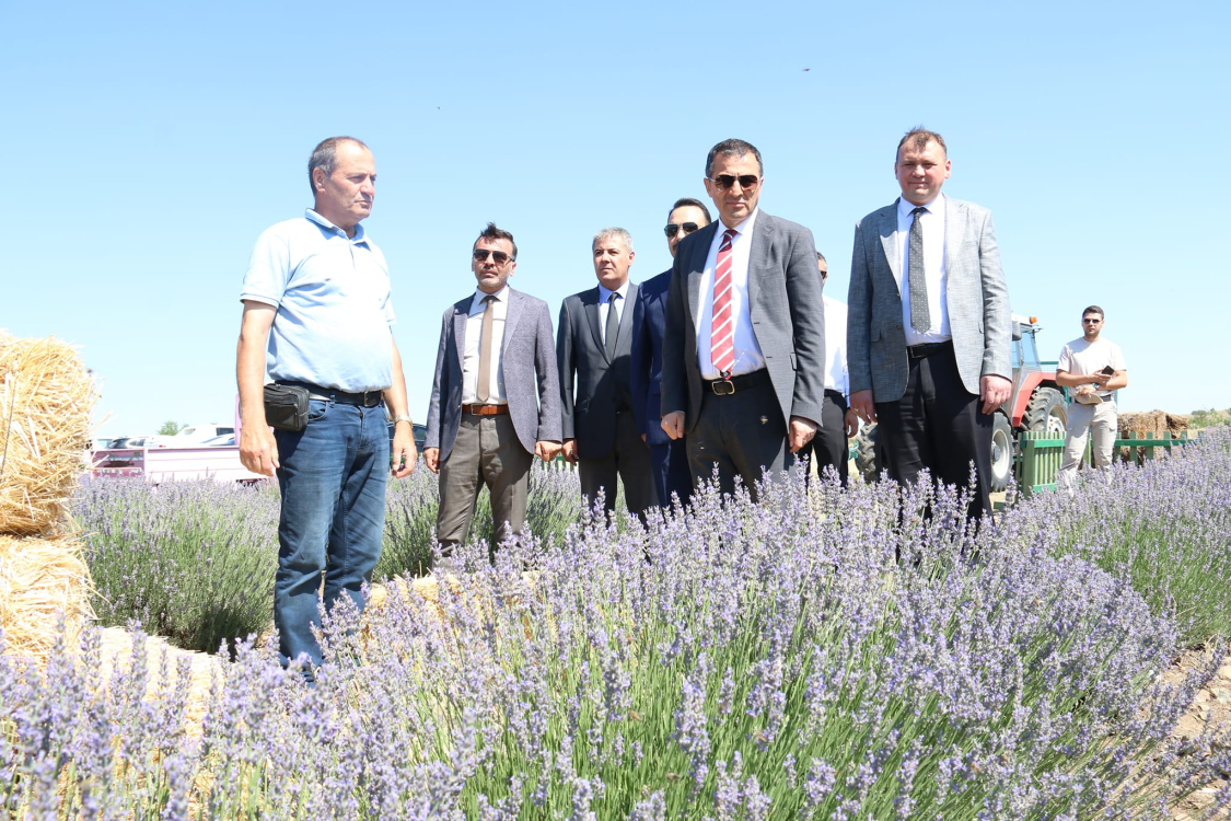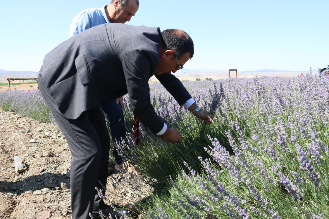 Lavanta Bahçesini gezerek incelemede bulunan ve ilk hasatı yapan Vali Öksüz, başlayan Lavanta Sezonu ve ürünlerle ilgili firma yetkililerinden bilgi aldı.