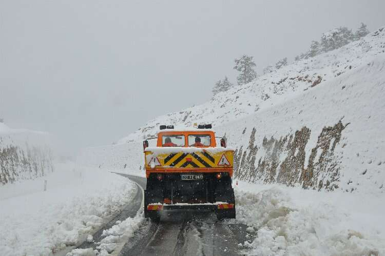 Beyaz örtüyle kaplanan yollarda Karayolları, Büyükşehir Belediyesi, Silifke Belediyesi ve Orman Bölge Müdürlüğü ekiplerinin temizlik işlemleri sürüyor.