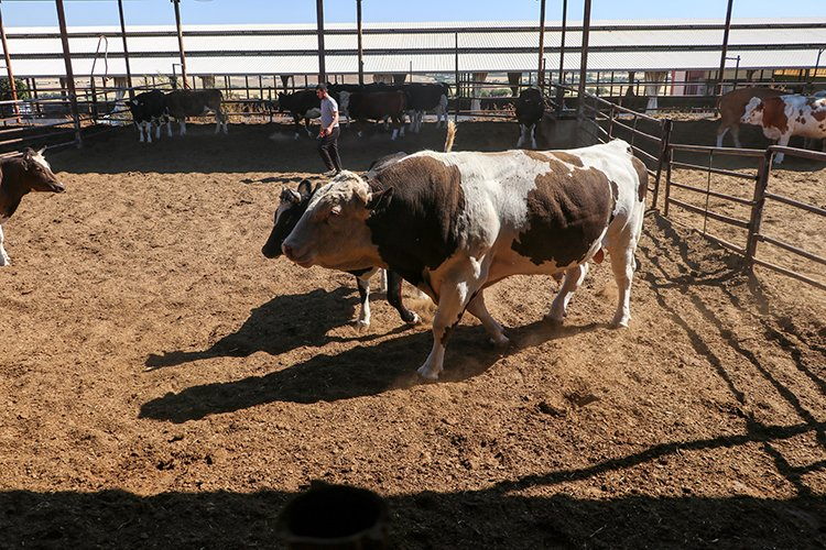 Oğuzeli ilçesi Karataş Mahallesi'ndeki büyükbaş hayvan çiftliğinde çalışan veteriner teknikeri Mehmet Can Bartık'ın yetiştirdiği 3,5 yaşındaki "Fıstık", alıcısını bekliyor.