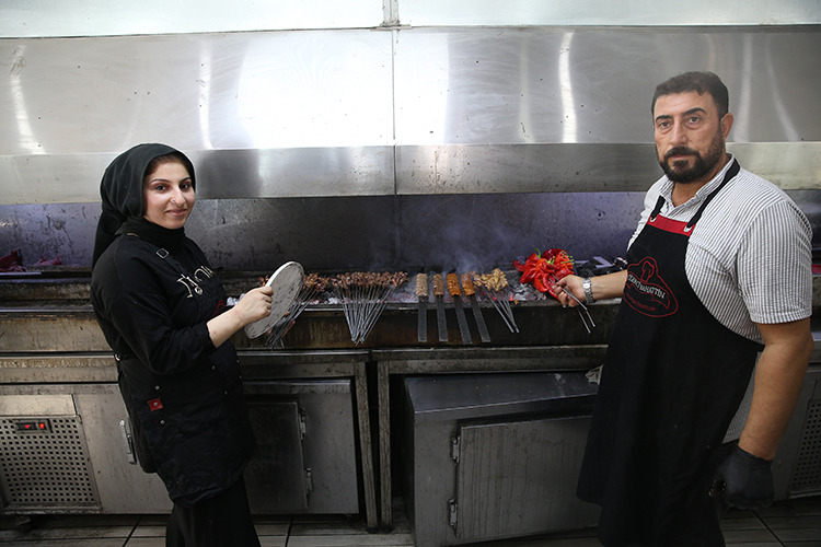 Babasıyla mutfakta doğradıkları etleri tek tek şişe saplayan Sevgi Avur, daha sonra mangalın başına geçip ciğer, Adana, Urfa ve patlıcan kebabını özenle pişiriyor.