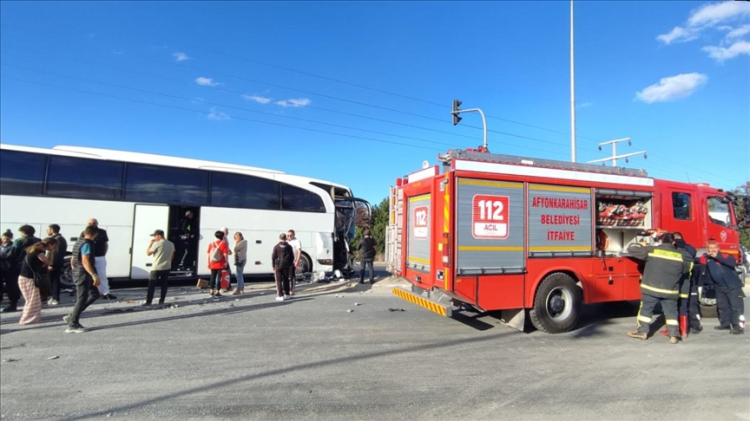 Afyonkarahisar'da yolcu otobüsüyle kamyonun çarpışması sonucu muavin yaşamını yitirdi, 19 kişi yaralandı.