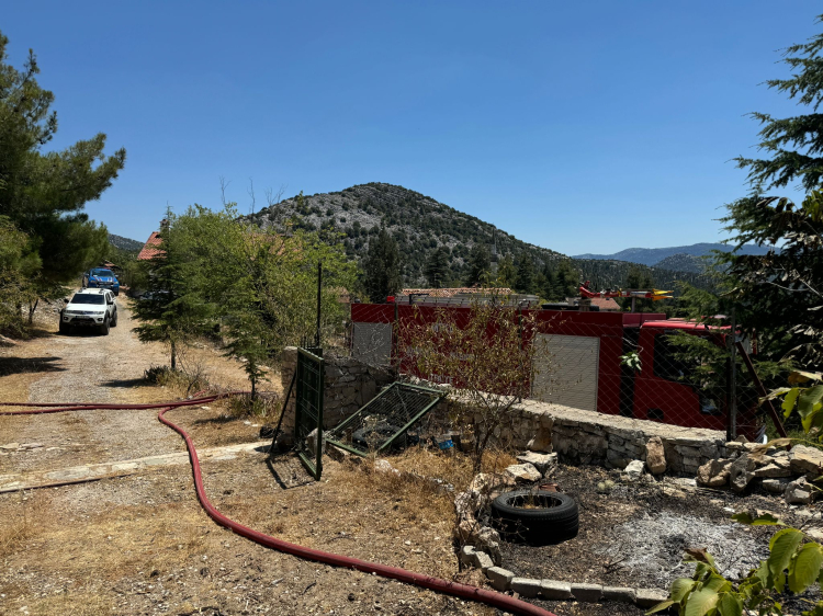 Antalya'nın Akseki ilçesindeki tarihi düğmeli evin bahçesinde çıkan yangında içerisinde meyve ağaçlarının bulunduğu otluk alan zarar gördü.