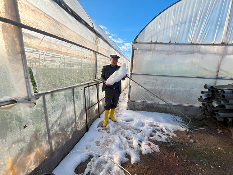 Antalya'nın Kumluca ilçesinde etkili olan dolu ve sağanak, seralarda hasara yol açtı.