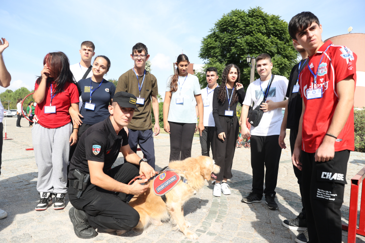 Eğitimlerde, afet anlarında ve sonrasında ne yapması gerektiği hakkında bilgi alan öğrencilere Antalya JAK ekibince, arama kurtarma köpekleriyle gösteri düzenlendi.