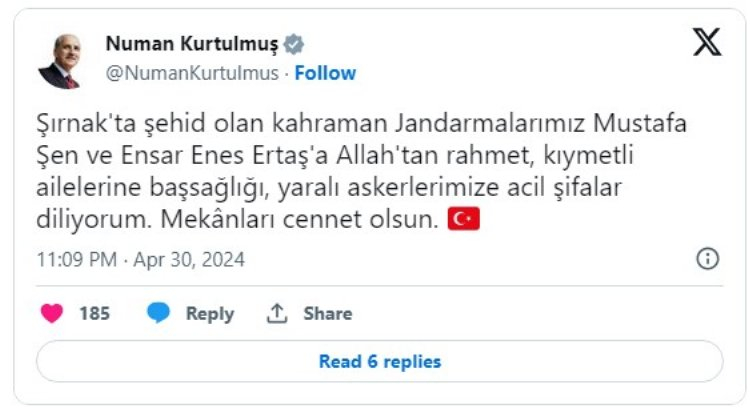 Kurtulmuş, sosyal medya hesabından yaptığı paylaşımda, "Şırnak'ta şehit olan kahraman jandarmalarımız Mustafa Şen ve Ensar Enes Ertaş'a Allah'tan rahmet, kıymetli ailelerine başsağlığı, yaralı askerlerimize acil şifalar diliyorum. Mekanları cennet olsun." ifadelerini kullandı.