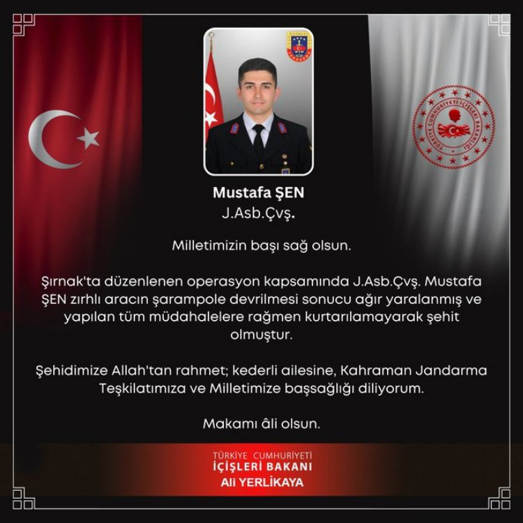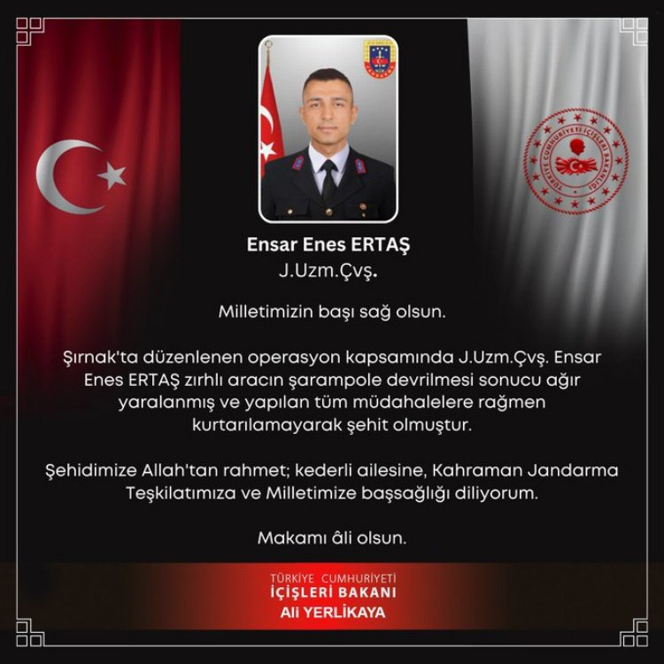 İçişleri Bakanı Ali Yerlikaya, sosyal medya hesabından "Milletimizin başı sağ olsun" ifadesiyle paylaştığı mesajında, Şırnak'ta düzenlenen operasyon kapsamında Jandarma Uzman Çavuş Ertaş ile Jandarma Astsubay Çavuş Şen'in zırhlı aracın şarampole devrilmesi sonucu ağır yaralandığını ve yapılan tüm müdahalelere rağmen kurtarılamayarak şehit olduğunu belirtti.