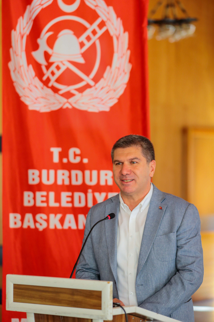 Konuşma yapan İtfaiye Müdürü Mehmet Ali Ballak “Ülkemizde 1714 yılında, Dergâhı Ali Tulumbacı Ocağı ile başlayan bu serüven, bugün 310. yılına ulaşmış durumda. Yangından depreme, trafik kazalarından diğer felaketlere kadar insanların en zor anlarında, afet anında ilk yardıma koşan itfaiyecilerdir. Gelişen teknoloji, iklimsel değişiklikler ve küresel ısınma nedeniyle afetlerin sayısı artmış ve etkileri derinleşmiştir. Türk itfaiyesi, bu afetlere karşı sürekli kendini yenilemeli; araç, malzeme ve ekipmanlarıyla çağa ayak uydurmalıdır. Burdur İtfaiye Müdürlüğü, modern araçları, malzeme ve ekipmanları, eğitimli ve cesur personeliyle sadece şehrimizin değil, ülkemizin afet anında Tüm Türkiye’nin umut kaynağı haline gelmiştir. Ülke genelinde meydana gelen yangınlarda ilk destek talep edilen itfaiyelerden biri Burdur olmuştur. Özellikle Kahramanmaraş depreminde, bölgeye ulaşan ilk donanımlı arama kurtarma ekibi yine Burdur İtfaiyesi olmuştur. Gittiği görevlerde üstün başarı sergileyen gözü kara cesur kahraman personelimiz, Maraş depremindeki çalışmalarından dolayı Devlet Üstün Hizmet ve Fedakârlık Madalyası ile onurlandırılmıştır. Teşkilatımızın geldiği bu noktada, özverili ve fedakâr kahraman itfaiyecilerimize ne kadar teşekkür etsek azdır. Ayrıca, itfaiyecilerimizi bir aile ferdi gibi gören, araç, malzeme ve ekipman ihtiyaçlarımızı bizzat takip eden, ilimize en modern donanımları kazandıran, her görevde yaşadığımız zorlukları yüreğinde hisseden ve her koşulda yanımızda olan Belediye Başkanımız Sayın Ali Orkun Ercengiz’e de teşekkürlerimi sunuyorum. Meslek büyüklerimiz, gözünüz arkada kalmasın. Bizler, sizlerden devraldığımız bayrağı şerefinize layık şekilde taşımaya devam ediyoruz. Hepinize teşekkür eder, saygılar sunarım.” Dedi