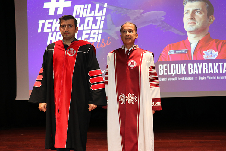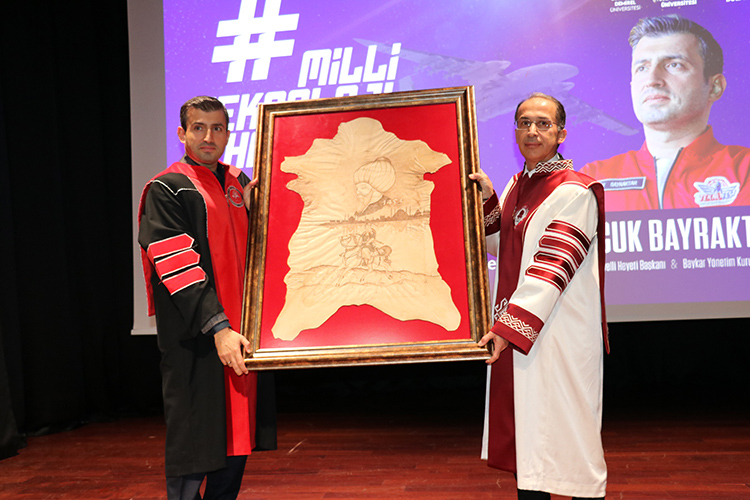 Konuşmasının ardından öğrencilerin sorularını yanıtlayan Selçuk Bayraktar'a, Süleyman Demirel Üniversitesince fahri doktora payesi verildi.