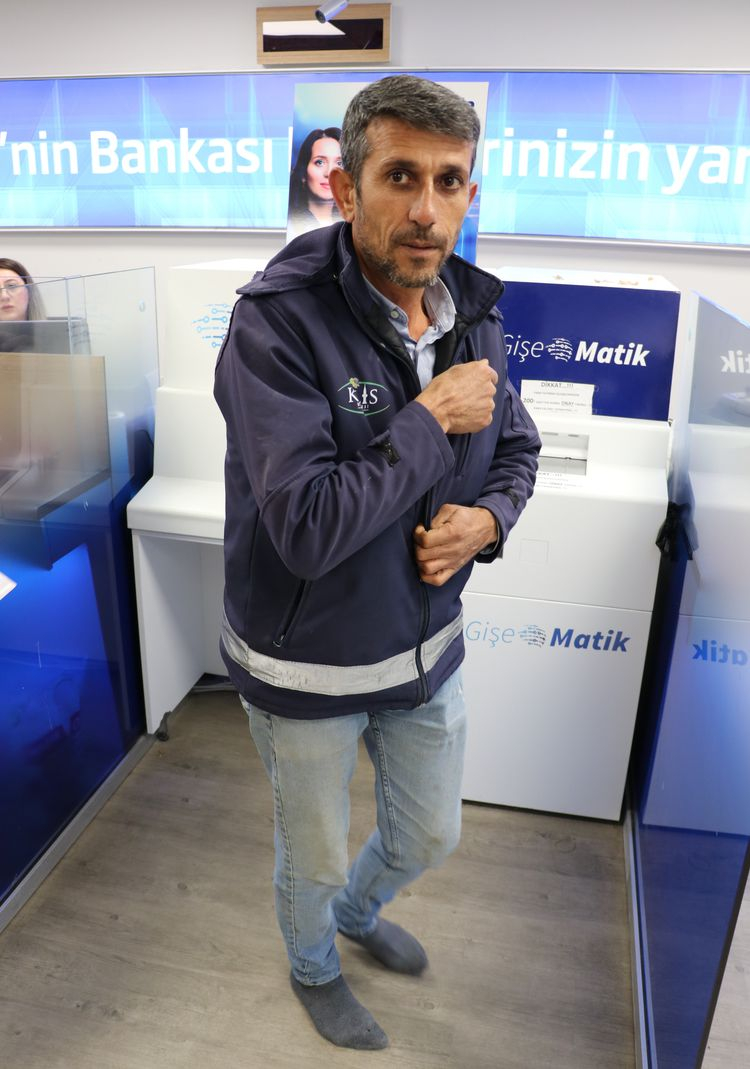 Kilis Belediyesi Park ve Bahçeler Müdürlüğünde çalıştığını belirten Özdemir, "Bankadan para çekmem gerekiyordu. Çizmem de çok çamur olduğu için dışarıda çıkartarak bankaya girdim. İçerisi çok temizdi kirlensin istemedim." dedi.