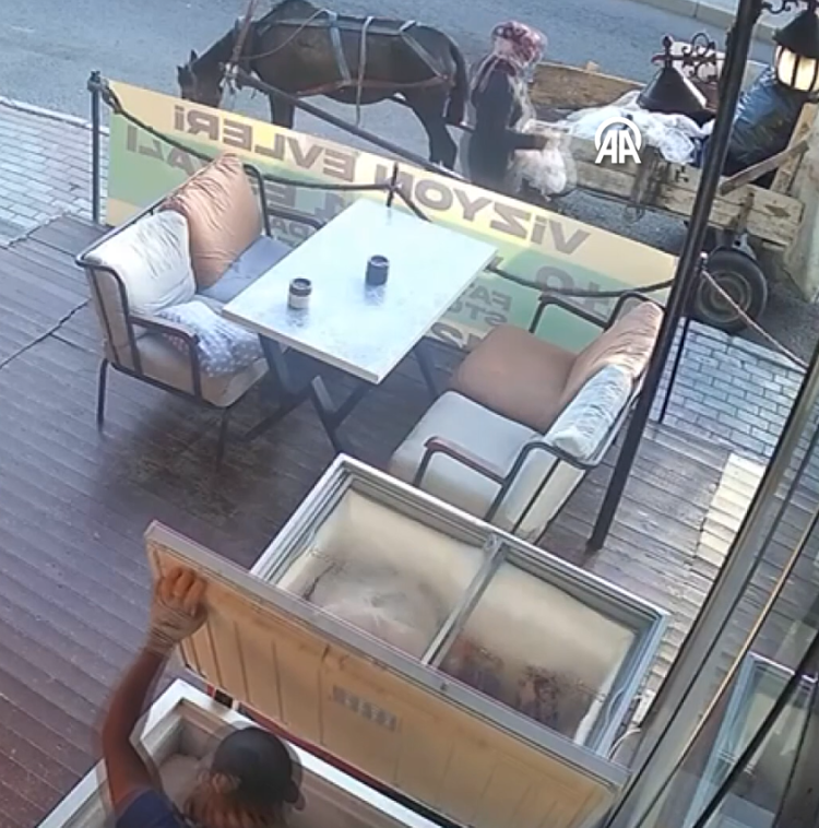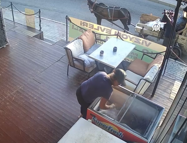 Hırsızlık anı iş yerinin güvenlik kameraları tarafından kaydedildi. Görüntülerde, restoranın önüne at arabasıyla gelen 2 kişinin dolaptan etleri alıp uzaklaşmaları yer alıyor.