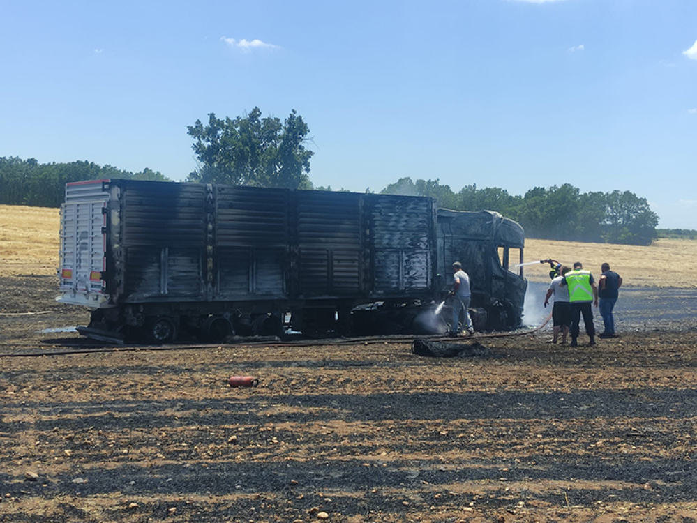 Buğdayın yüklendiği tırda henüz bilinmeyen nedenle yangın çıktı. Rüzgarın etkisiyle yangın anızlık alana da yayıldı.