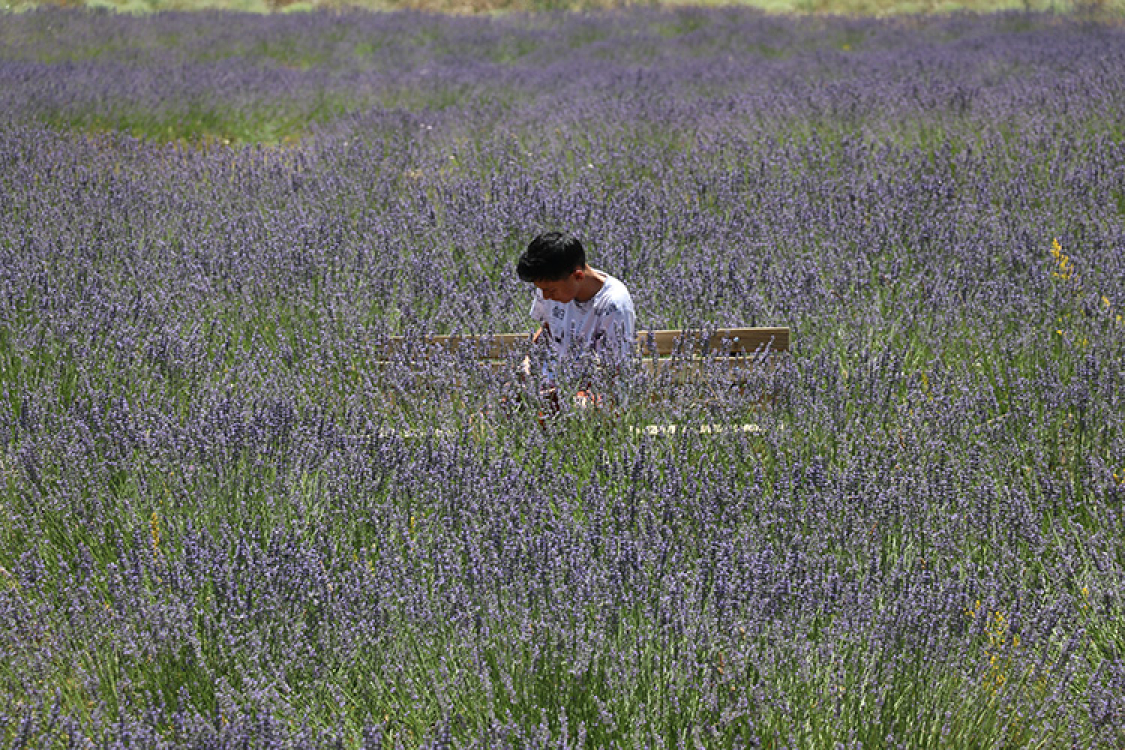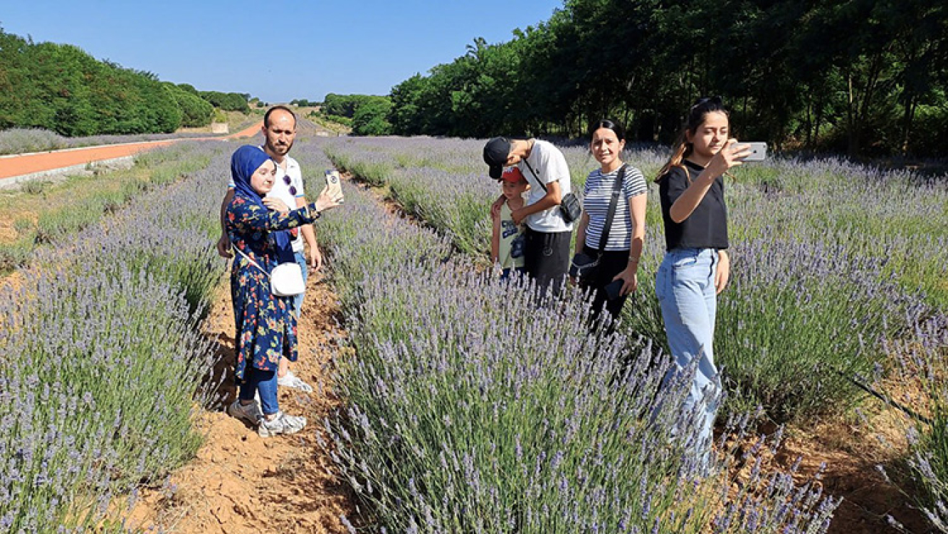 Bahçenin 35 dekarına ekilen lavantaların mor renkteki çiçeklerini açmasıyla oluşan ahenk, kartpostallık karelerde yer almak isteyen ziyaretçilerini kendine çekiyor.