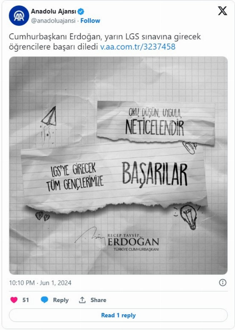 Erdoğan, sosyal medya hesabından paylaştığı mesajda, "LGS'ye girecek evlatlarımızın gözlerinden öpüyor, her birine başarılar diliyorum. Sınavın genç kardeşlerime ve değerli ailelerimize hayırlı sonuçlar getirmesini temenni ediyorum. Allah zihin açıklığı versin." ifadelerini kullandı.