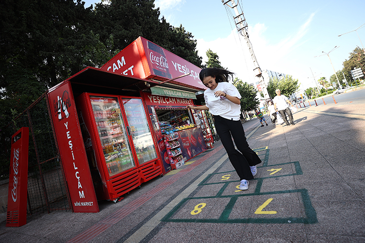 Mersin'de büfesinin önüne seksek oyunu çizen Kahraman Baykal, gencini yaşlısını çocukluğuna götürdü.