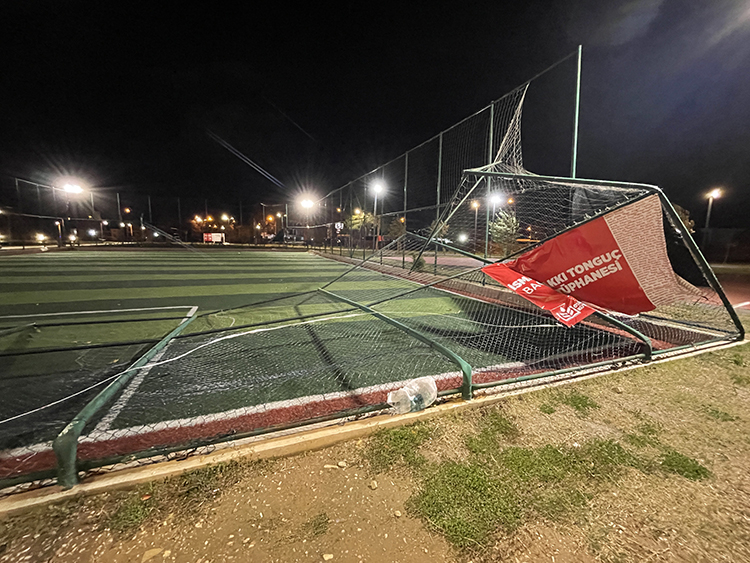 Soğanlı Millet Bahçesi'ndeki halı sahanın demir korkulukları da şiddetli rüzgarda devrildi.