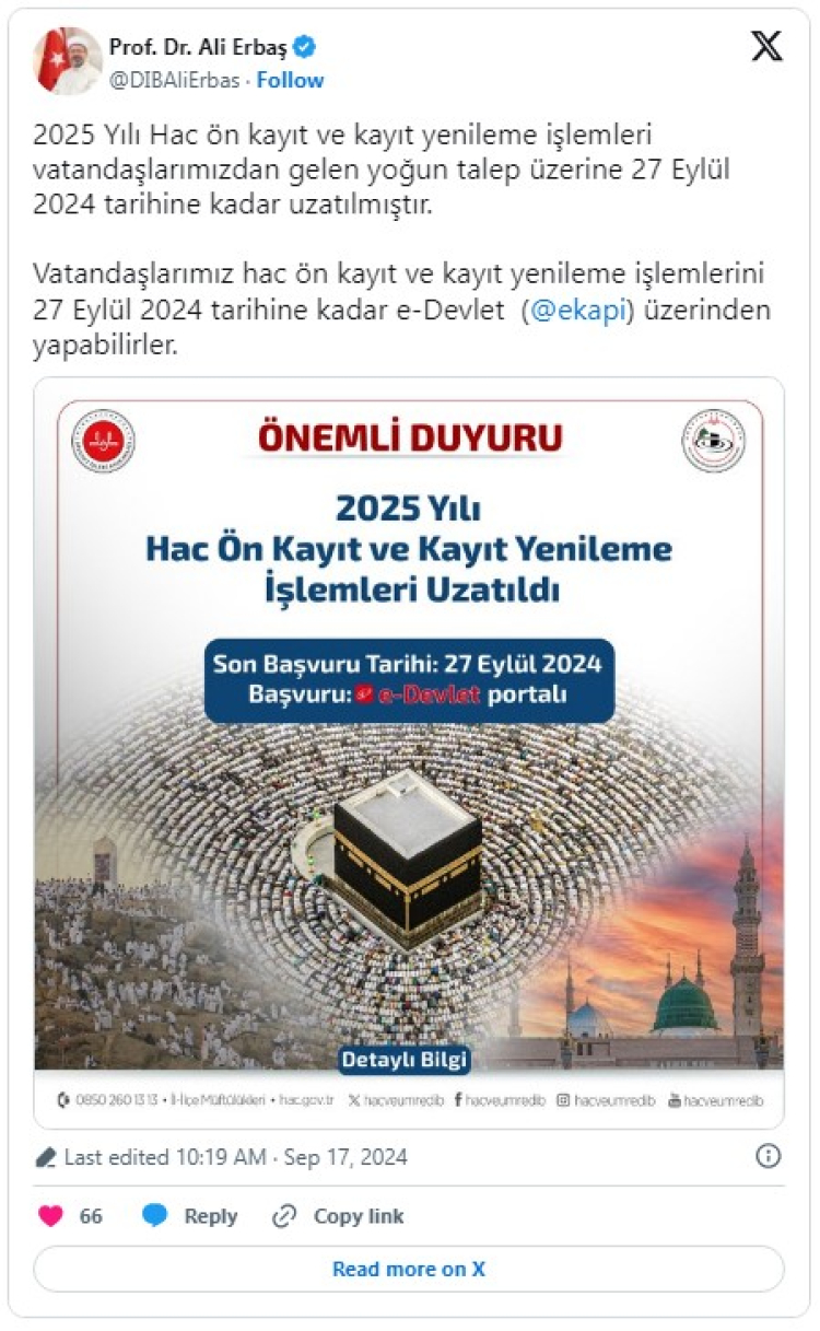 Erbaş, sosyal medya hesabından yaptığı açıklamada, vatandaşlardan gelen yoğun talep üzerine uzatılan 2025 yılı hac ön kayıt ve kayıt yenileme işlemlerinin, 27 Eylül'e kadar e-Devlet üzerinden gerçekleştirilebileceğini kaydetti.