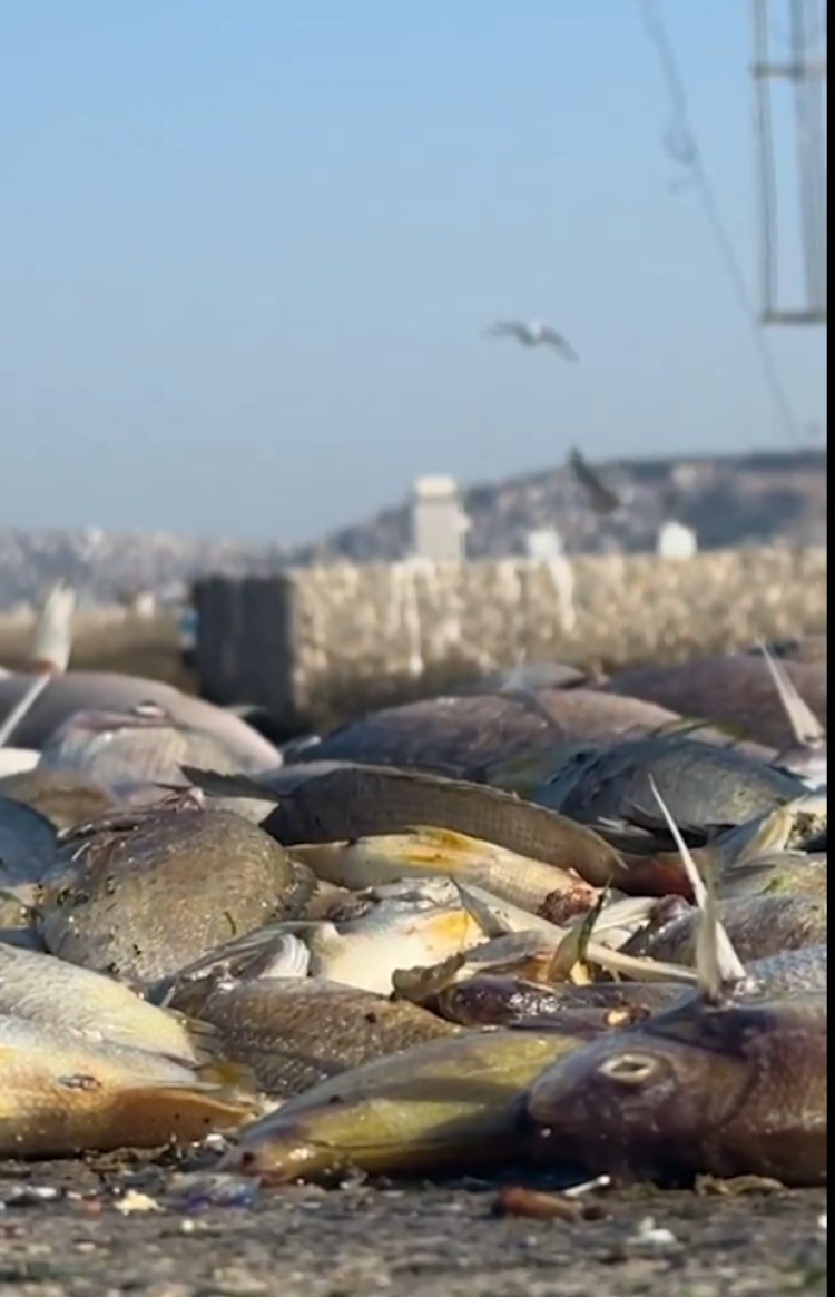 İzmir Körfezi'nde kirliliğin etkisiyle çok sayıda ölü balığın kıyıya vurduğu görüldü.
