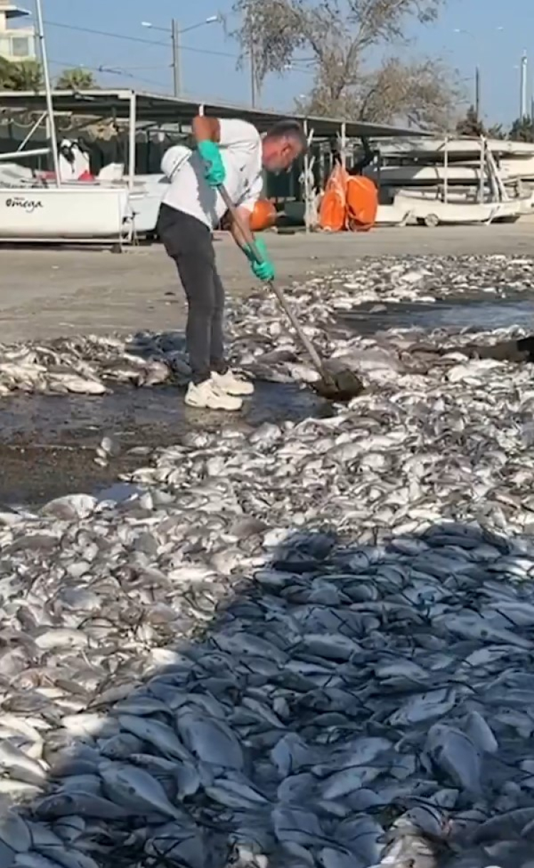 İzmir Büyükşehir Belediyesi ekipleri ise denizdeki ölü balıkları toplamak için çalışma yürütüyor.