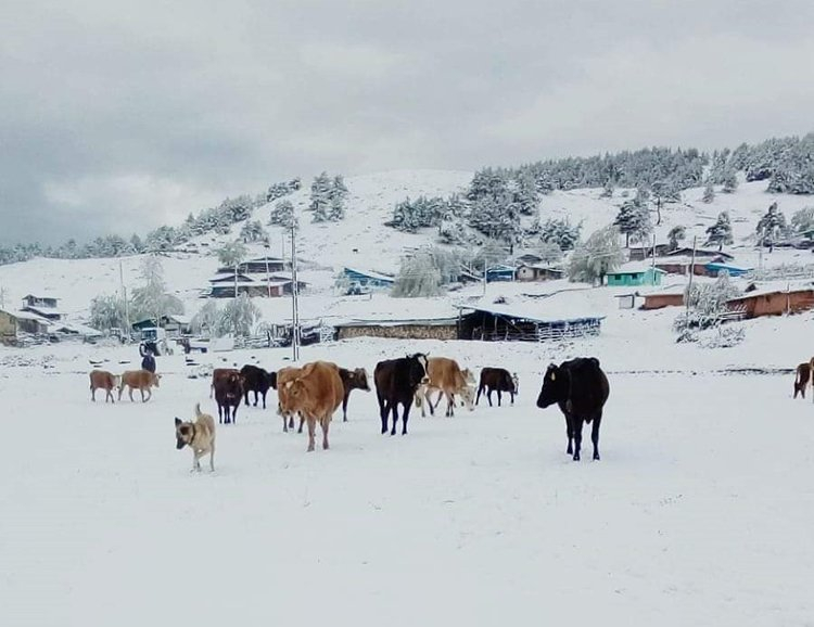 İlçenin 1760 rakımlı en yüksek yaylası olan Yeni Yayla'da sabah saatlerinde başlayan kar yağışı, meraları beyaza bürüdü.