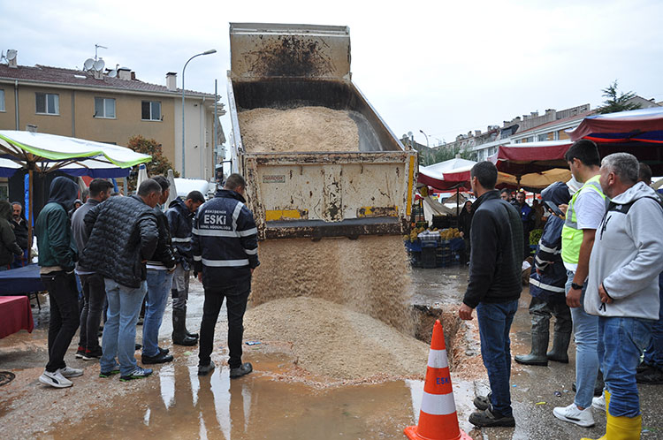 Odunpazarı ilçesi Yıldıztepe Mahallesi'nde semt pazarının kurulduğu Millet Caddesi'nde sağanak nedeniyle çökme meydana geldi.