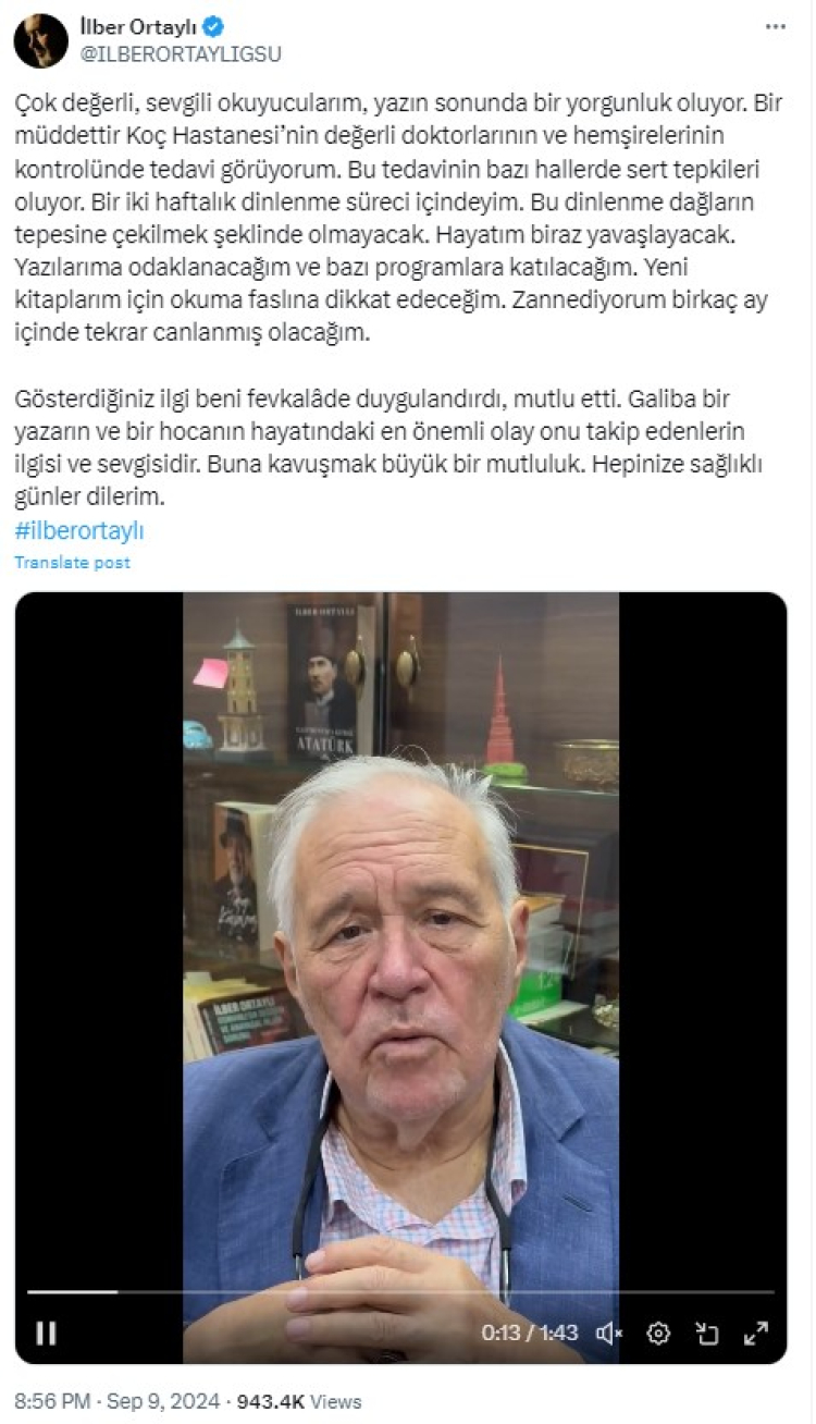 Prof. Dr. Ortaylı, X hesabında yaptığı videolu paylaşımda, bir süredir Koç Hastanesinde tedavi gördüğünü belirterek, şunları kaydetti: