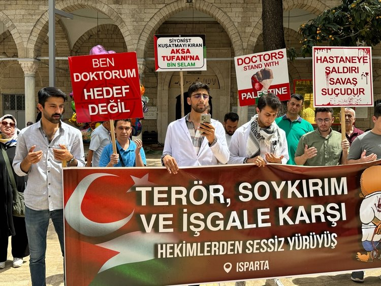 Isparta'da, Kaymakkapı Meydanı'ndaki Gazze çadırı önünde toplanan tıp fakültesi öğrencileri ve sağlık çalışanları, ellerindeki dövizlerle Mimar Sinan Camisi önüne yürüdü.