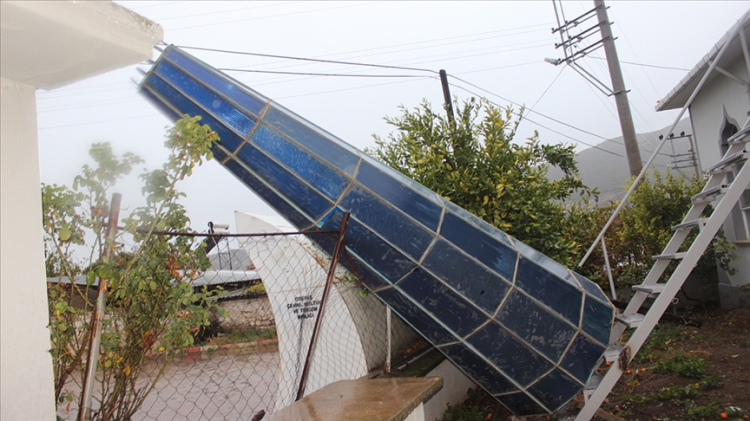 İzmir'in Ödemiş ilçesinde etkili olan şiddetli rüzgar bir cami minaresinin külahını devirdi