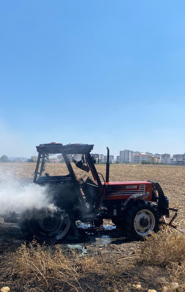 Samet N'nin kullandığı 80 AFM 164 plakalı traktör, Cengiz Topel Mahallesi'ndeki tarlada çalışma yaptığı sırada alev aldı.