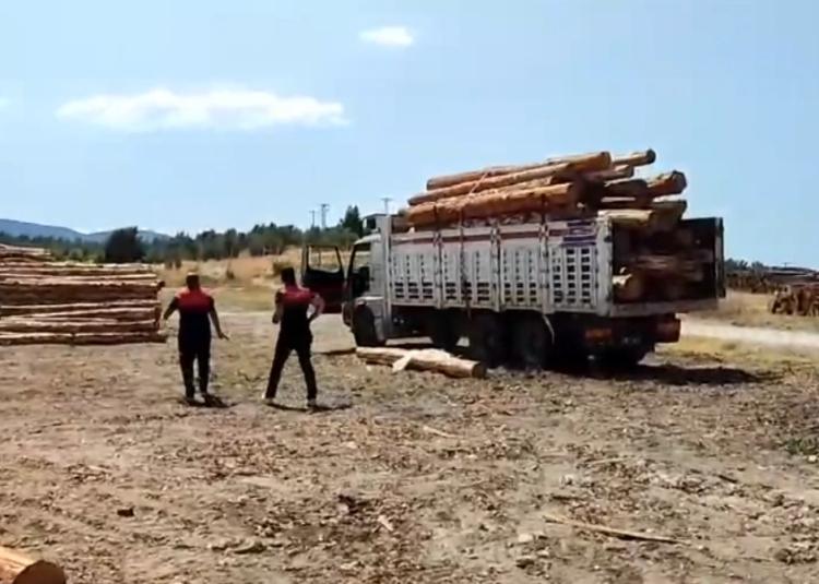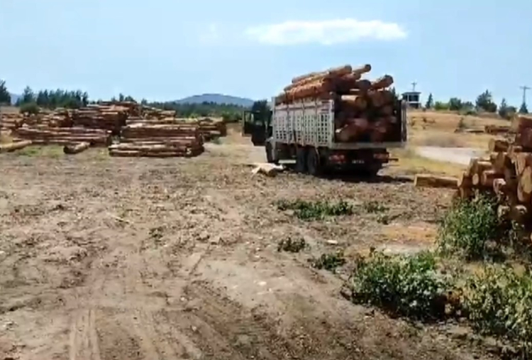 Sürücü Hasan Evci (60), Bayramiç'in Korucak köyündeki ormanlık alanda yapılan ağaç kesiminden elde edilen tomrukları, 17 AAG 571 plakalı kamyonla Yağcılar odun deposuna götürdü.