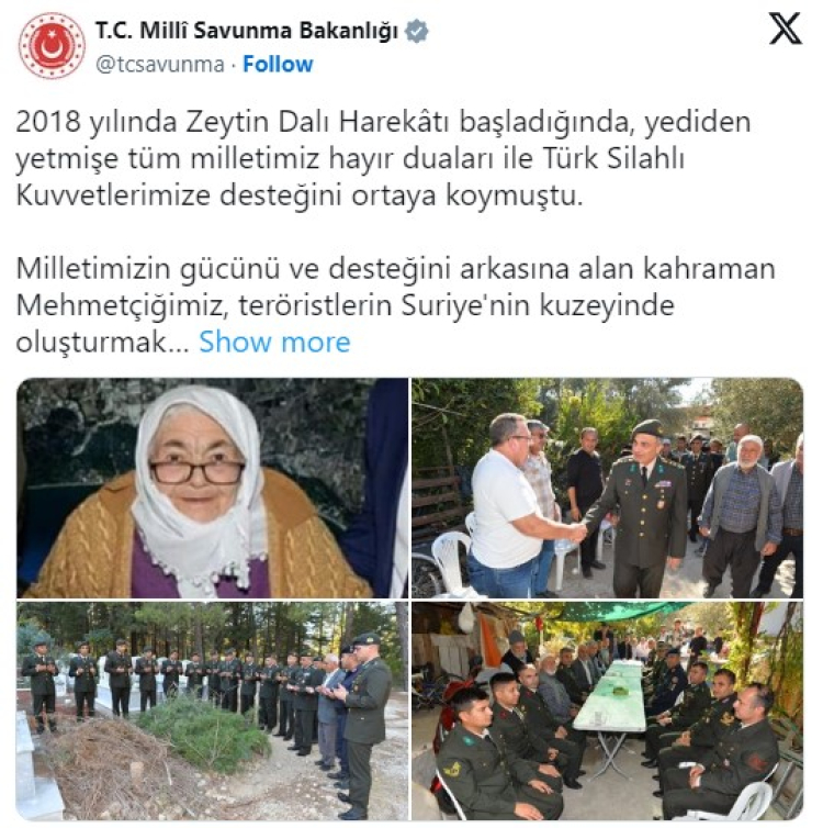 Bakanlıktan yapılan açıklamada, Zeytin Dalı Harekatı başladığında, yediden yetmişe tüm Türkiye'nin hayır duaları ile Türk Silahlı Kuvvetlerine desteğini ortaya koyduğu anımsatıldı.