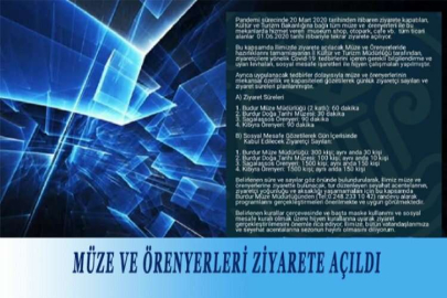 Burdur Valiliği’nden yapılan açıklama ile dün ziyarete açılan Müze ve ören yerlerinde ziyaret sırasında uyulacak kurallar paylaşıldı. Valilik’ten yapılan açıklamada; “Pandemi sürecinde 20 Mart 2020 tarihinden itibaren ziyarete kapatılan, Kültür ve Turizm Bakanlığına bağlı tüm müze ve örenyerleri ile bu mekanlarda hizmet veren museum shop, otopark, cafe vb. tüm ticari alanlar 01.06.2020 tarihi itibariyle tekrar ziyarete açıldı. Bu kapsamda Burdur’da ziyarete açılacak Müze ve Örenyerleri de hazırlıklarını tamamlayan İl Kültür ve Turizm Müdürlüğü tarafından, ziyaretçilere yönelik Covid-19 tedbirlerini içeren gerekli bilgilendirme ve uyarı levhaları, sosyal mesafe işaretleri ile hijyen çalışmaları yapıldı. Ayrıca uygulanacak tedbirler dolayısıyla müze ve örenyerlerinin mekansal özellik ve kapasiteleri gözetilerek günlük ziyaretçi sayıları ve ziyaret süreleri planlandı. Ziyaret Süreleri Budur Müze Müdürlüğü (2 katlı): 60 dakika Burdur Doğa Tarihi Müzesi: 30 dakika Sagalassos Örenyeri: 90 dakika Kibyra Örenyeri: 90 dakika, Sosyal Mesafe Gözetilerek Gün İçerisinde Kabul Edilecek Ziyaretçi Sayıları: Burdur Müze Müdürlüğü: 300 kişi; aynı anda 30 kişi, Burdur Doğa Tarihi Müzesi: 100 kişi; aynı anda 10 kişi, Sagalassos Örenyeri: 1500 kişi; aynı anda 150 kişi, Kibyra Örenyeri: 1500 kişi; aynı anda 150 kişi, Belirlenen süre ve sayılar göz önünde bulundurularak, Burdur müze ve örenyerlerine ziyarette bulunacak, tur düzenleyen seyahat acentelarının, ziyaretçi yoğunluğu ve aksaklığı yaşamamaları için bu kapsamda Burdur Müze Müdürlüğünün 0.248.233 10 42 nolu telefonundan randevu alarak programlarını gerçekleştirmeleri isteniyor. Belirlenen kurallar çerçevesinde ve başta maske kullanımı ve sosyal mesafe kuralı olmak üzere hijyen kurallarına uyarak ziyaret gerçekleştirilmesi büyük önem arz ediyor” ifadelerine yer verildi.