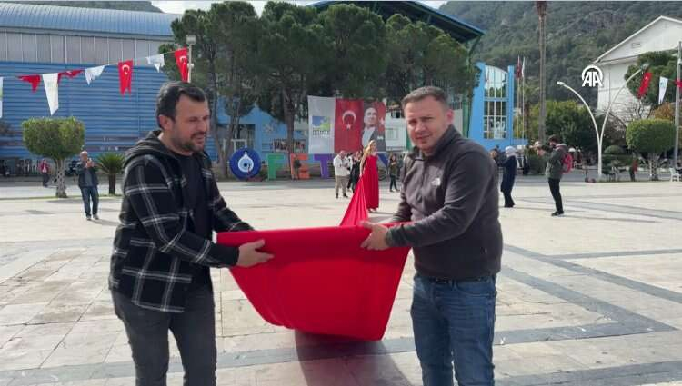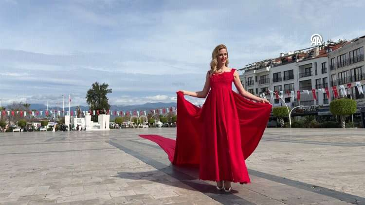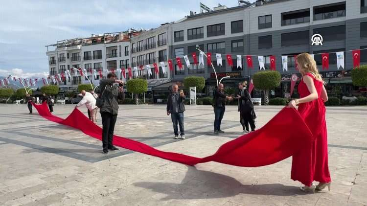 Cumhuriyetin 100. yılı ve Sevgililer Günü dolayısıyla hazırlanan, 100 metre kuyruğu bulunan kırmızı gelinlik, Muğla'nın Fethiye ilçesinde tanıtıldı.