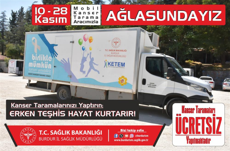 Konuyla ilgili olarak Burdur İl Sağlık Müdürlüğü tarafından yapılan açıklamada; “Kanser Erken Teşhis, Tarama Ve Eğitim Merkezi (KETEM) (Mobil Mamografi ve Serviks Kanseri Tarama) aracımızla Ücretsiz Kanser Taramaları İçin 10-28 Kasım tarihleri arasında Ağlasun’dayız!