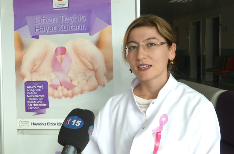 Sıla Gül, “Sağlıklı Hayat Merkezimizde aslında kanser farkındalığı adına zaman zaman pek çok çalışma yapıyoruz. Gerek kurumlara eğitimlere gidiyoruz, gerek halkımızla birebir görüşmeler yapıyoruz. Buraya başvuran kişilere de danışmanlık verebiliyoruz. Kanserlerle ilgili tarama testleri yapıyoruz. Özellikle meme kanseri de hem ülkemizde hem dünyada sık görülen bir kanser olması, erken tanı ile çabuk yakalanıp tam küre türlerinin olması ve bunun yanında geç kaldığımız zaman hem çok uzun ve zorlu tedavi süreçlerine hem de ölüme kadar götürebilen bir kanser türü olması sebebiyle daha çok üzerinde durduğumuz bir konu. Birinci basamakta biz kanser erken teşhis, tanı, tarama yöntemleri yapıyoruz. Bazı kanser türleri için elimizde çok pratik testler var. Özellikle meme, rahim ağzı kanseri ve kolon kanseri gibi bazı kanserler için neden bu kanserlere bakıyoruz dersek bir testin tarama testi olabilmesi için aslında bir sürü kriter var. Görülen hastalığın bir çok kişiyi etkileyen önemli bir halk sağlığı problemi önemli bir sağlık problemi olması lazım. Bulunan testin kolayca uygulanabilir pratik kişiye toplumun etik değerlerine uygun olması lazım. Maddi olarak ta daha pratik bir yöntem olması lazım. bu sebeple bunları karşılayabilen bu testi yaptığımızda gerçekten pozitif doğruluk oranını iyi elde edebildiğiniz bir şey olması lazım. Bu ve bunun gibi kriterler sebebiyle de belli başlı bazı kanser türleri için elimizde uygun tarama testleri var. Meme kanseri için de çok basit maliyeti çok düşük, hastaya vereceği zararı çok minimal olan bazı yöntemler var. Öncelikle aslında erkekleri de etkileyen bir kanser türü ama çok düşük oranlarla görüldüğü için biz daha çok kadınlar üzerine meme dokusu daha yoğun olduğu için kadınlar üzerinde duruyoruz. 20 yaşından itibaren her kadının her ayın belirlediği bir günde özellikle adetten sonraki 5 ila 7. Günde dokudaki ödemde azalıp muayene daha rahat olabileceği için elle muayene yapmasını öneriyoruz. Elle muayeneyi her ayın belirli bir gününde kendi kendine duşta iken yapabilir. Ayna karşısına geçip yapabilir. Gözle ve ellerle muayene şeklinde ellerimizin iç tarafı ile yapıyoruz. 20 yaşından itibaren 2 senede bir klinik meme muayenesi yani herhangi bir doktorunuz tarafından yapılacak meme muayenesi ve 40 yaşından itibaren de bunu sıklaştırarak yılda bir meme muayenesi şeklini öneriyoruz. 40 yaşından itibaren 69 yaşına kadar mamografi ile yılda bir kez tarama öneriyoruz. Biz zaman zaman mamografi aracımızla gerek merkezimizde gerek sahaya çıkarak taramalar yapıyoruz. Bunun dışında hastanelerde de pratik kısa bir test yapılabiliyor. Okullarda, Kur’an Kurslarında, çeşitli kurum kuruluşlarda broşürler dağıtarak birebir görüşerek sadece bu ay içerisinde 300-350 vatandaşımıza ulaştık” dedi.