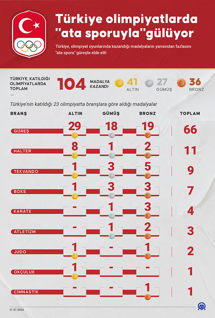 Türkiye, olimpiyat oyunlarında kazandığı madalyaların yarısından fazlasını "ata sporu" güreşte elde etti.