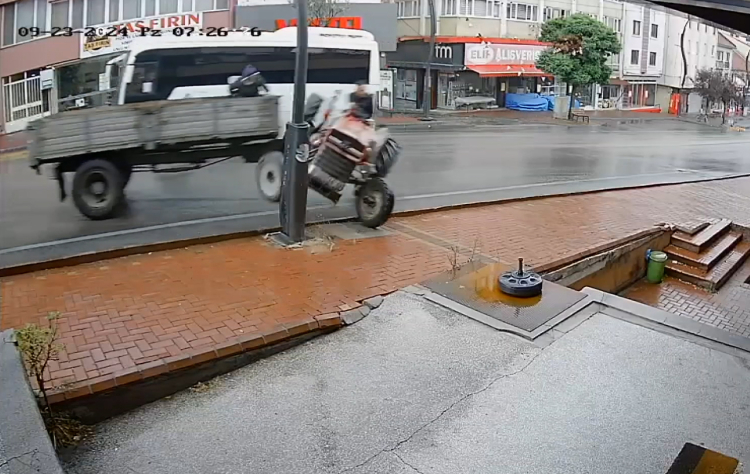 Görüntülerde, ıslak yolda kontrolden çıkan traktörün aydınlatma direğine çarptıktan sonra takla atması ve ayrılan römorkun yaklaşık 50 metre ilerideki direğe çarptıktan sonra durması yer alıyor.
