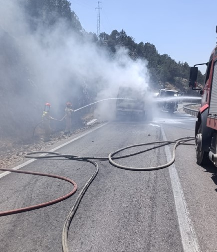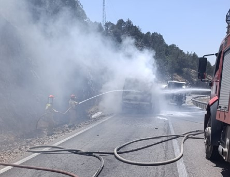 Burdur'un Ağlasun ilçesi Peçenek Mevkiinde Kamyonda Çıkan Yangın ormanlık alana sıçramadan söndürüldü