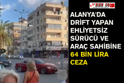 Antalya'nın Alanya ilçesinde, başkasına ait otomobil ile drift yaptığı tespit edilen ehliyetsiz sürücüye ve araç sahibine 64 bin 626 lira ceza uygulandı.