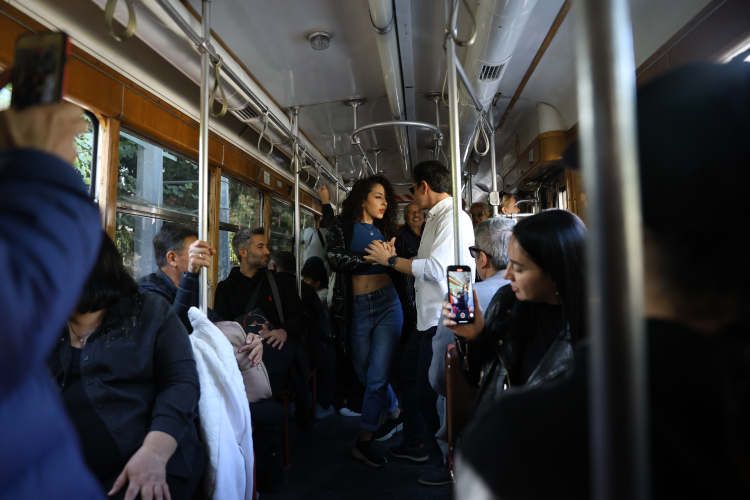 Mezbaha ile müze arası yolculuk yapan tramvaya binen yolcular, çalınan melodilere eşlik ederken, bazı yolcular da tango eşliğinde dans etti.