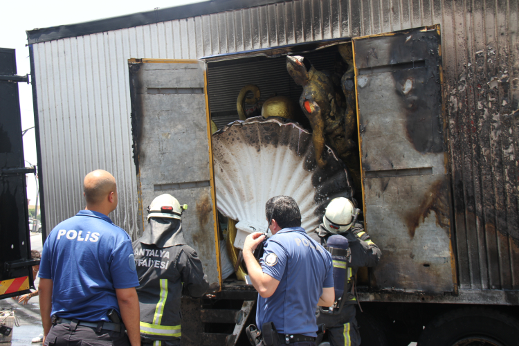 Yangın nedeniyle içerisinde animasyon dekor malzemesi bulunduğu belirlenen kamyonun kasa bölümü tamamen yandı.