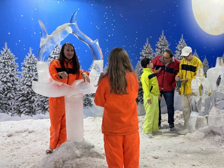 Ortam sıcaklığının sıfırın altında 2 derece olduğu eğlence merkezinde ziyaretçiler, bir yandan serinliğin tadını çıkarırken, diğer yandan 3 heykeltıraş tarafından 50 ton buz kullanılarak yapılan buz heykellerle fotoğraf çektirebiliyor.