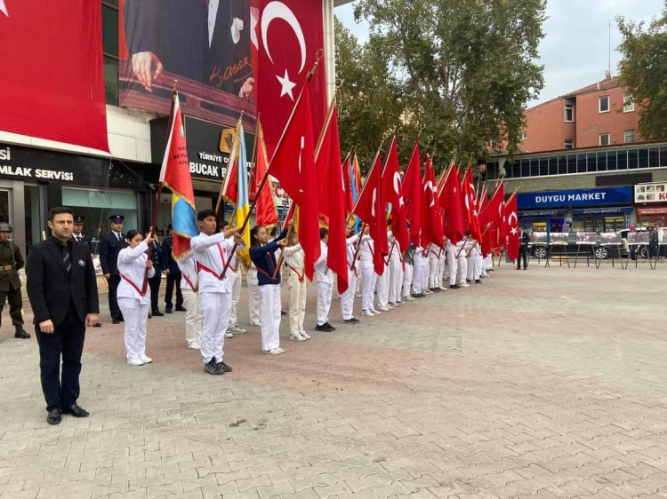 Ardından, saat 9’u 5 geçe sirenler eşliğinde, 2 dakika saygı duruşunda bulunuldu ve İstiklal Marşı okundu.