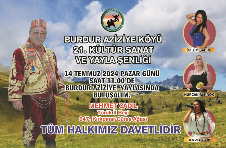 Saat 11.00’de başlayacak olan “Aziziye Köyü 21. Kültür, Sanat ve Yayla Şenliği’nde Türk Halk Müziği Sanatçıları Arzu Gök, Nurcan Altınok ve Özlem Şahin sahne alacak. Burdur Yörük İl Beyi, 647. Kırkpınar Güreş Ağası Hayırsever İş İnsanı Mehmet Cadıl ve Aziziye Köyü Muhtarı Ali Kozak, Burdur merkez, ilçe, belde ve köyleriyle çevre il ve ilçelerden herkesi şenliğe davet etti. Aziziye Köyü 21. Kültür, Sanat ve Yayla Şenliği, 14 Temmuz Pazar günü, Kanal 15 ekranlarından canlı yayınla izleyicilere aktarılacak.