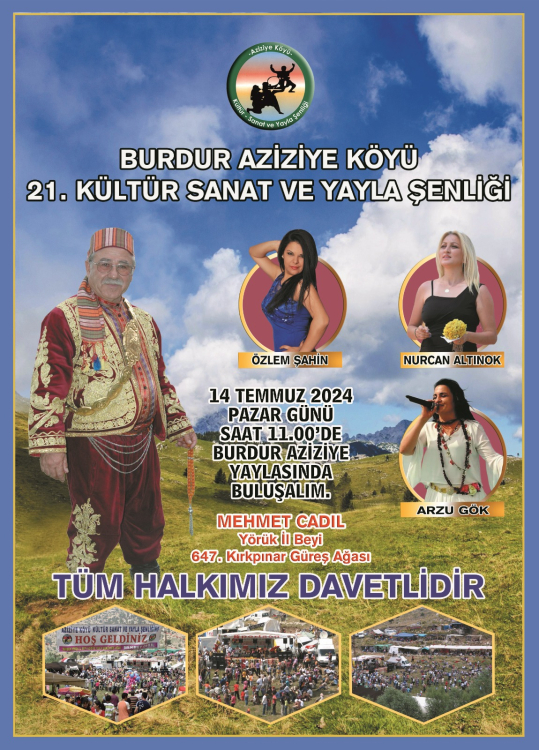 Burdur’un Aziziye Köyü’nde Portsan Mermer Yönetim Kurulu Başkanı Burdur Yörük İl Beyi Hayırsever İş İnsanı Mehmet Cadıl tarafından bu yıl 21. düzenlenecek olan “Aziziye Köyü Kültür, Sanat ve Yayla Şenliği” 14 Temmuz Pazar günü yapılacak.