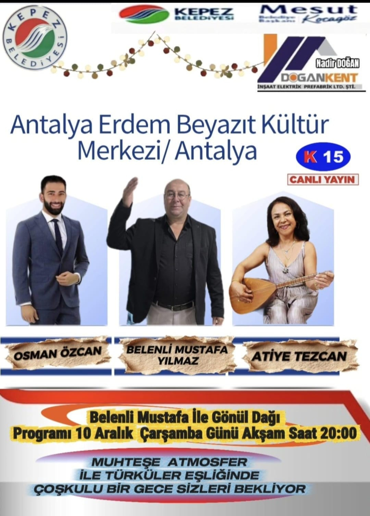 Belenli Mustafa’nın hazırlayıp sunduğu “Gönül Dağı” programının bu haftaki konuğu Osman Özcan ve Atiye Tezcan olacak. Belenli Mustafa ve konukları sevilen türküleri, canlı yayında sizler için seslendirecek. Antalya Erdem Bayazıt Kültür Merkezi’nden 10 Aralık Çarşamba akşamı saat 20.00’de yayınlanacak olan “Belenli Mustafa ile Gönül Dağı” programını sakın kaçırmayın. Ayrıca program halka açık ve ücretsiz.