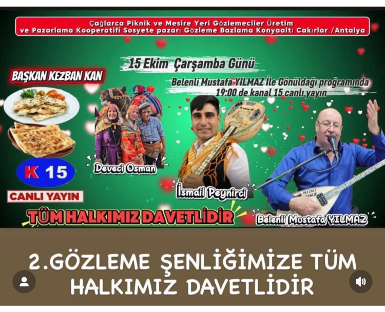 Belenli Mustafa’nın hazırlayıp sunduğu “Gönül Dağı” programının ilk konuğu İsmail Peynirci olacak. Belenli Mustafa ve konuğu İsmail Peynirci sevilen türküleri, canlı yayında sizler için seslendirecek. Ayrıca programda, Çağlarca Piknik ve Mesire Yeri Gözlemeciler Üretim ve Pazarlama Kooperatifi Başkanı Kezban Kan ile Deveci Osman da yer alacak. Antalya’nın Konyaaltı ilçesinde bulunan Çakırlar Sosyete Pazarı’ndan bugün akşam saat 20.00’de canlı yayınla yeni sezona “Merhaba” diyecek olan müzik ve eğlence dolu programı sakın kaçırmayın.